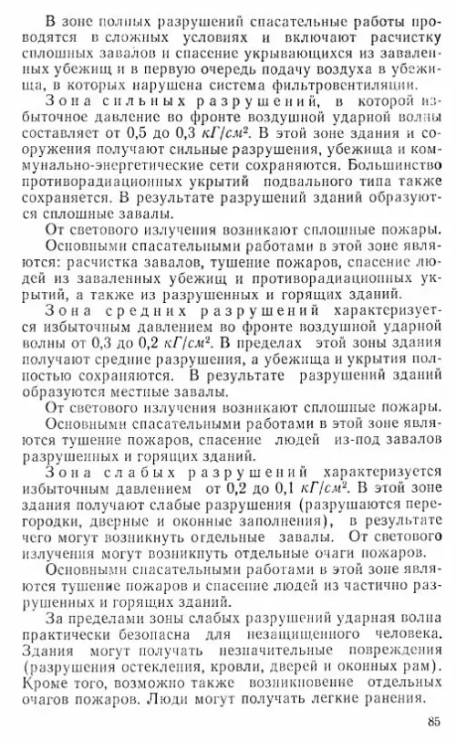 2. The zone of severe destruction and severe to moderate human injury—a radius of up to 2–2,5 km (overpressure of 0,3–1 kg/cm²). However, according to the work "The Effect of the Atomic Bomb in Japan," within a radius of 2,5 km, all wooden buildings were destroyed, and brick buildings were reduced to rubble. The area where buildings were severely damaged or destroyed had a radius of over 3 km, while Bugnion (see above) reports a radius of 4–5 km.