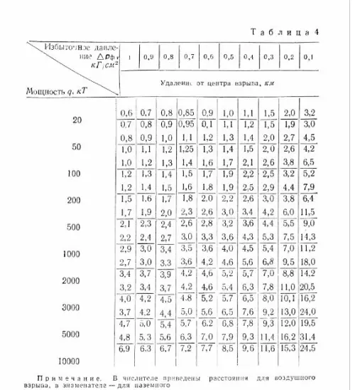 The following tables (according to the textbook by Egorov P.T. et al. Civil Defense, 1970) show the pressure assessment depending on the distance to the target and the power of the munition and the nature of damage to buildings depending on the excess pressure of the wave and (0,1 kgf/cm2 = 9,8 kPa).